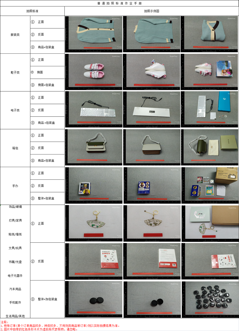 - Not professional photography: Only covers basic perspectives (overall view, labels, defects, etc.), excluding multi-angle lighting or contextual display